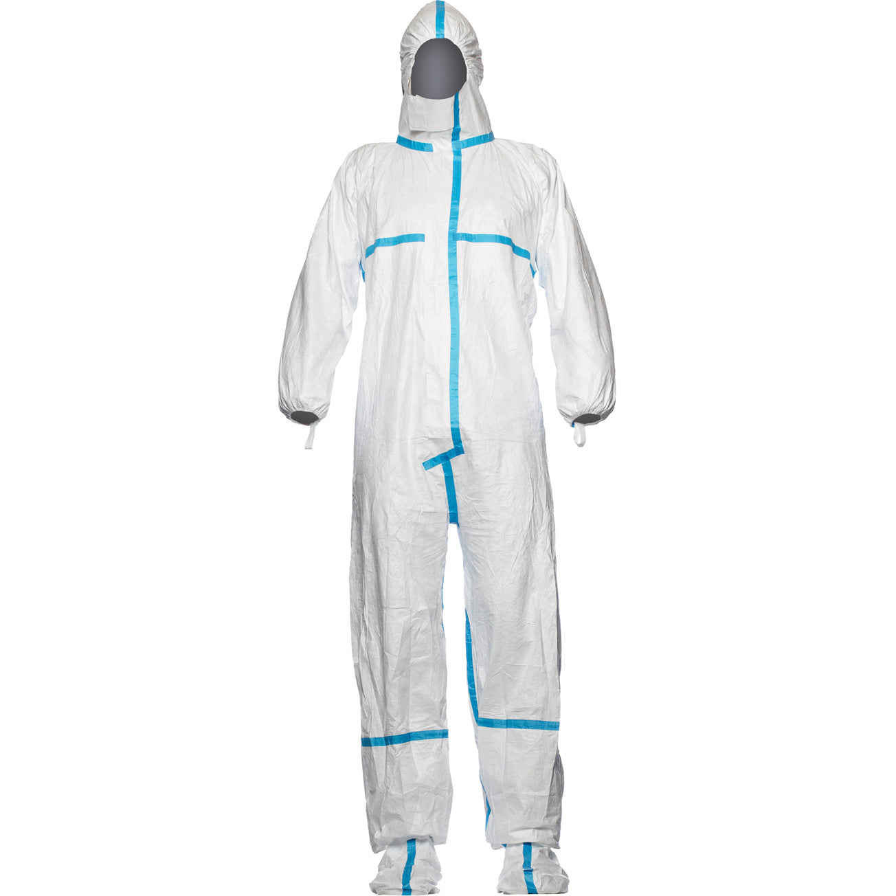 * White, hooded coverall* Attached socks and boot flaps* Stitched and over taped seams * Thumb loops* Tunnelled elastication at wrists, ankles, and face* Elasticated waist (glued-in)* Tyvek zipper* Self-adhesive zipper and chin flap CAT III Type 4-B, 5-B, 6-BEN 1073-2:2002EN 14605:2005 + A1:2009EN ISO 13982-1:2004 + A1:2010EN 13034:2005 + A1:2009EN 14126:2003 EN 1149-5:2008