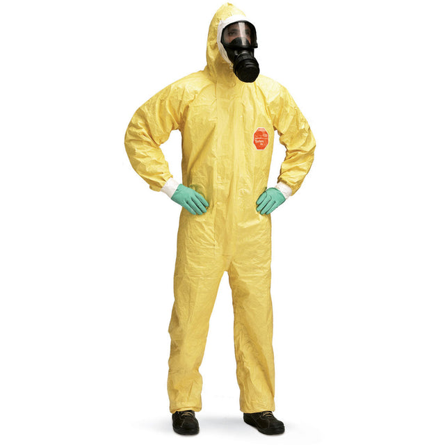 DuPont Tychem® C, model CHA5. Hooded coverall.Available in bright yellow for high visibility. * Elasticated face, wrists, waist and ankles for an optimal fit, thumb loops prevent sleeves from riding up. * Self-adhesive chin flap for tight seal of suit to face-masks. * Made from a lightweight and durable fabric (<450g per garment).Tychem® C garments utilise the strength of Tyvek® and a polymeric barrier coating to offer good permeation barrier protection against a wide range of inorganic chemicals and biological hazards (even under pressure). Tychem® C is used for splash or pressurised splash protection in a variety of industrial environments, including pulp and paper manufacturing, food processing, chemical processing and pharmaceutical manufacturing.Chemical protective clothing, Category III, Type 3-B, 4-B, 5-B and 6-BEN 14126 (barrier to infective agents), EN 1073-2 (protection against radioactive contamination)Antistatic treatment (EN 1149-5) - on insideStitched and over-taped seams with barrier tape for protection and strength.Self-adhesive double zipper flap closure system for higher protection.